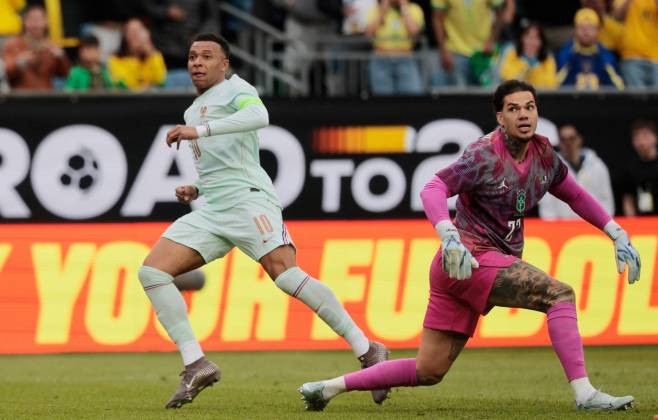 E os franceses não demoraram a abrir o marcador. Aos 31 minutos do primeiro tempo Dembelé lançou em profundidade para Mbappé, que partiu em velocidade e encontrou muita liberdade para bater por cobertura na saída do goleiro Ederson.